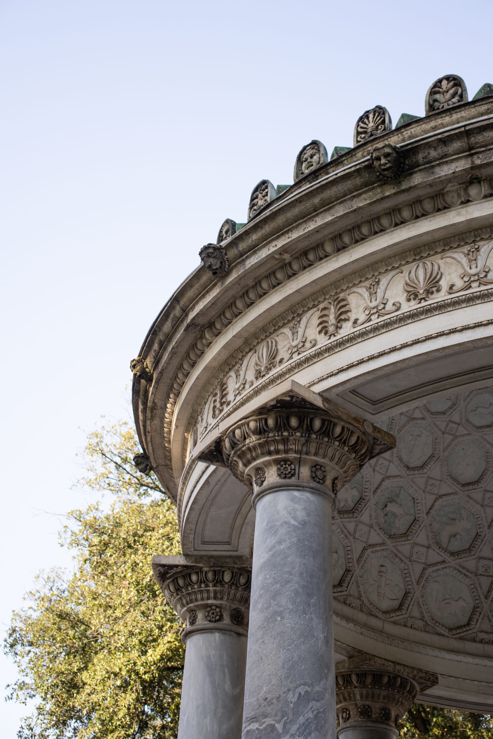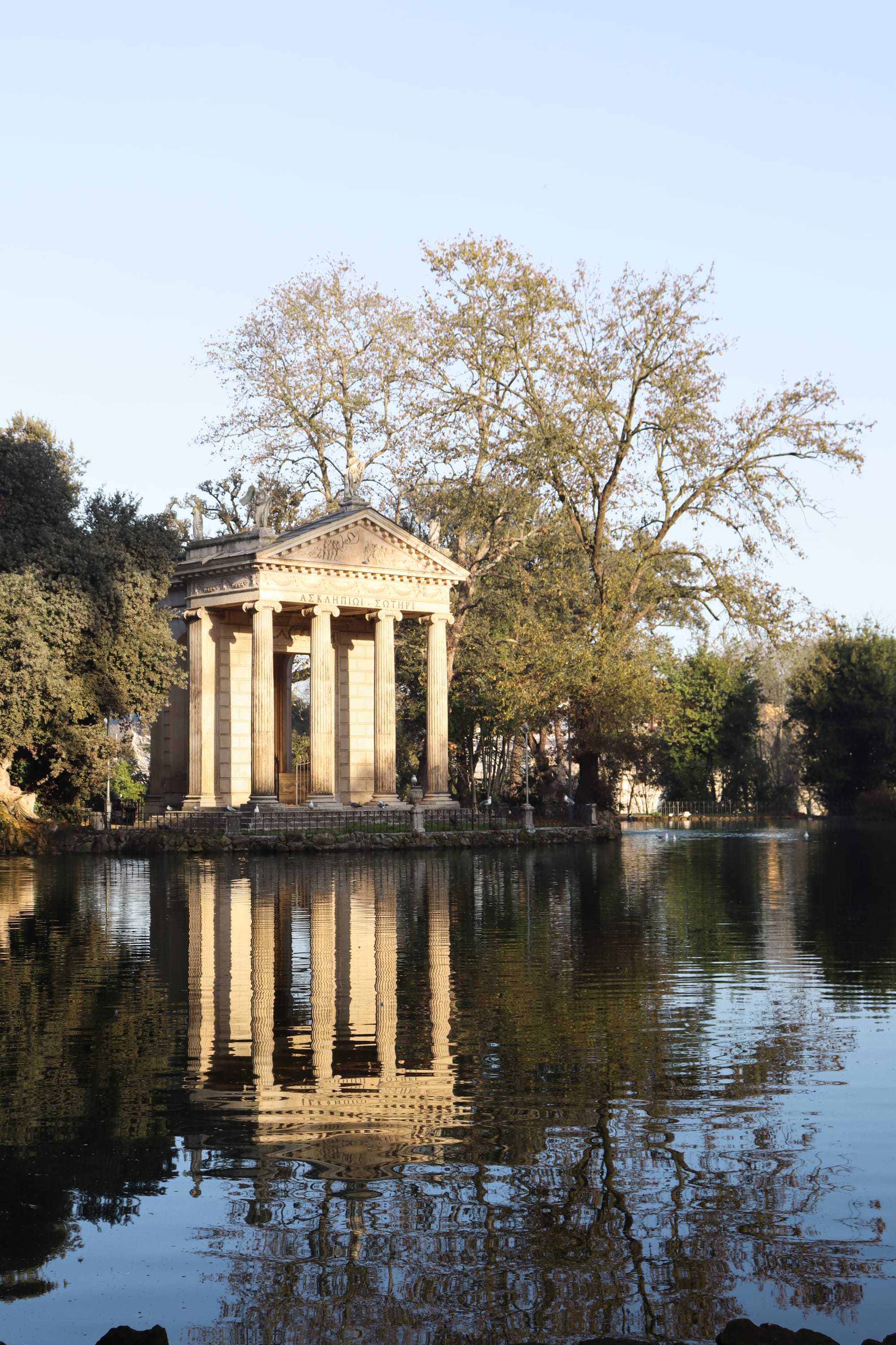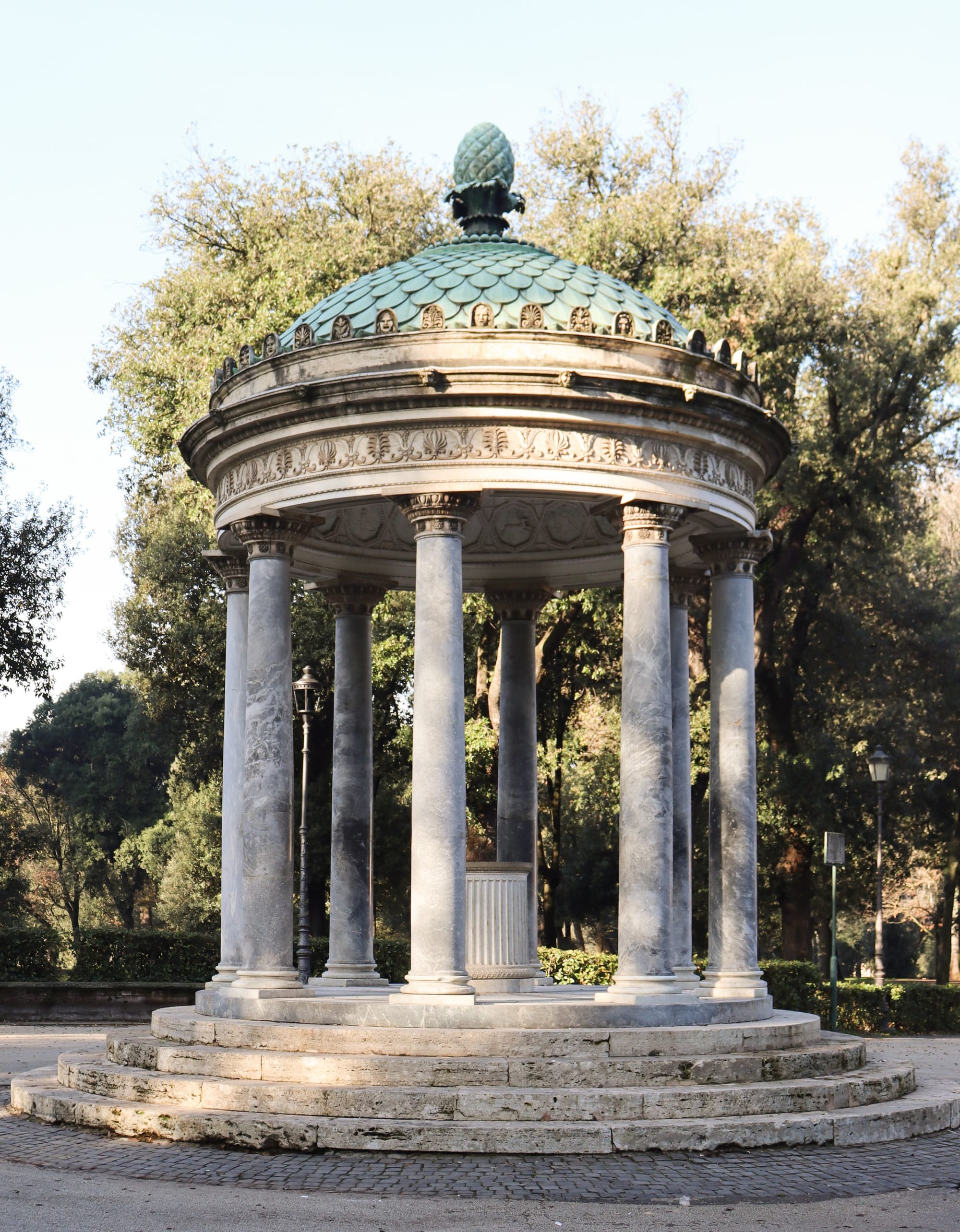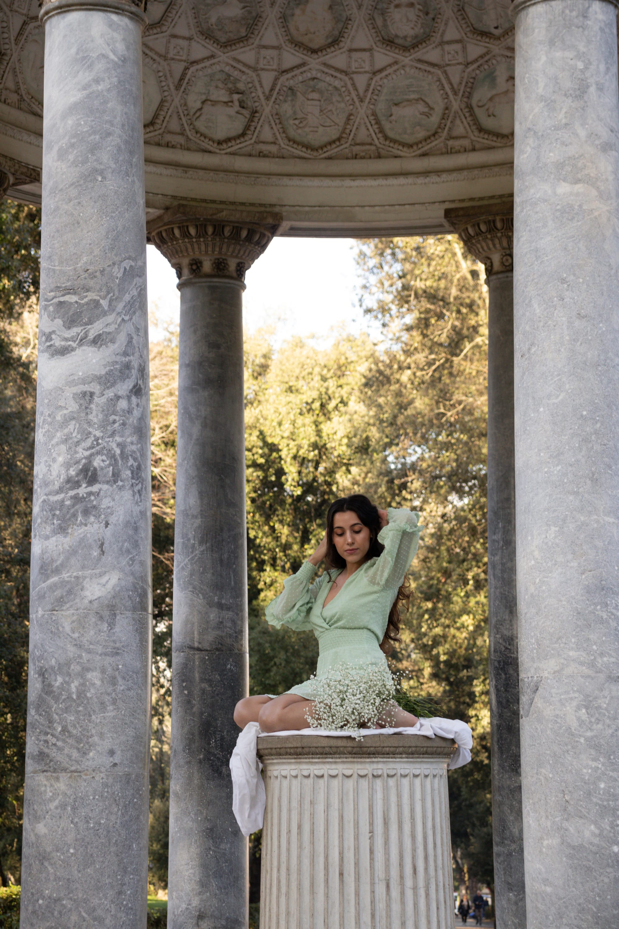 We chose a sunny morning, perfect for the photo shoot in the gardens of Villa Borghese. We began with a couple of shots near the laghetto, the small lake where romantic couples paddle around in small boats. In the middle of it, the Temple to Aesculapius stands, and to its side, hidden among the trees, a statue of a woman with a pitcher seems to be pouring water into the lake. It is a beautiful sculpture, but its greenish color and standing beside a much more monumental structure make it go unnoticed. In a way, it is a metaphor for what happens when visiting Rome; so often captivated by the great monuments, we lose sight of some charming details that are less prominent. A few steps further, another temple is dedicated to the huntress goddess. Although its look suggests that it is from an earlier period, the Tempietto of Diana was created in the 18th century. Eight gray marble columns surround a truncated base where the sculpture of Diana of Gabies once stood, now in the Louvre Museum in Paris.