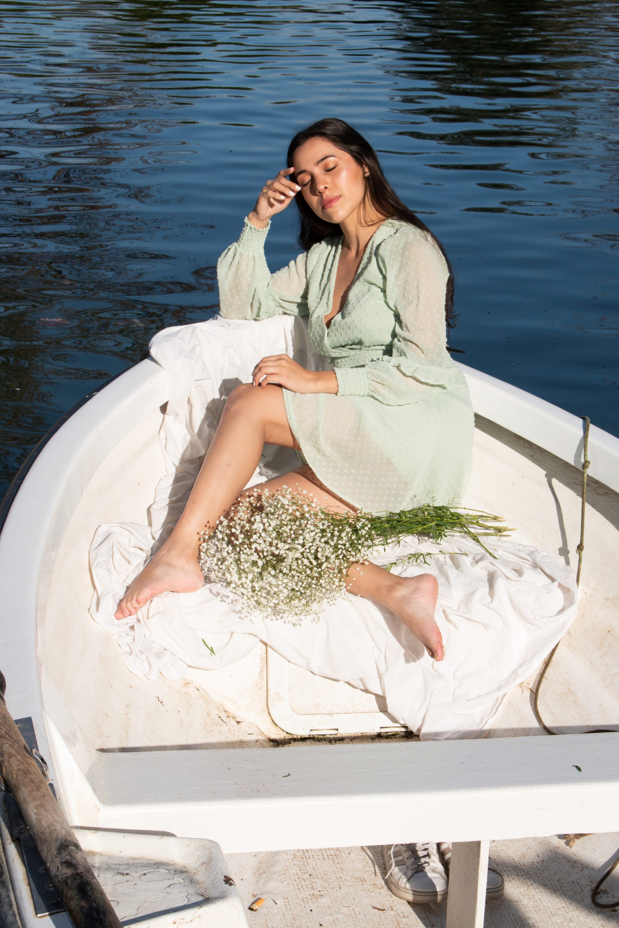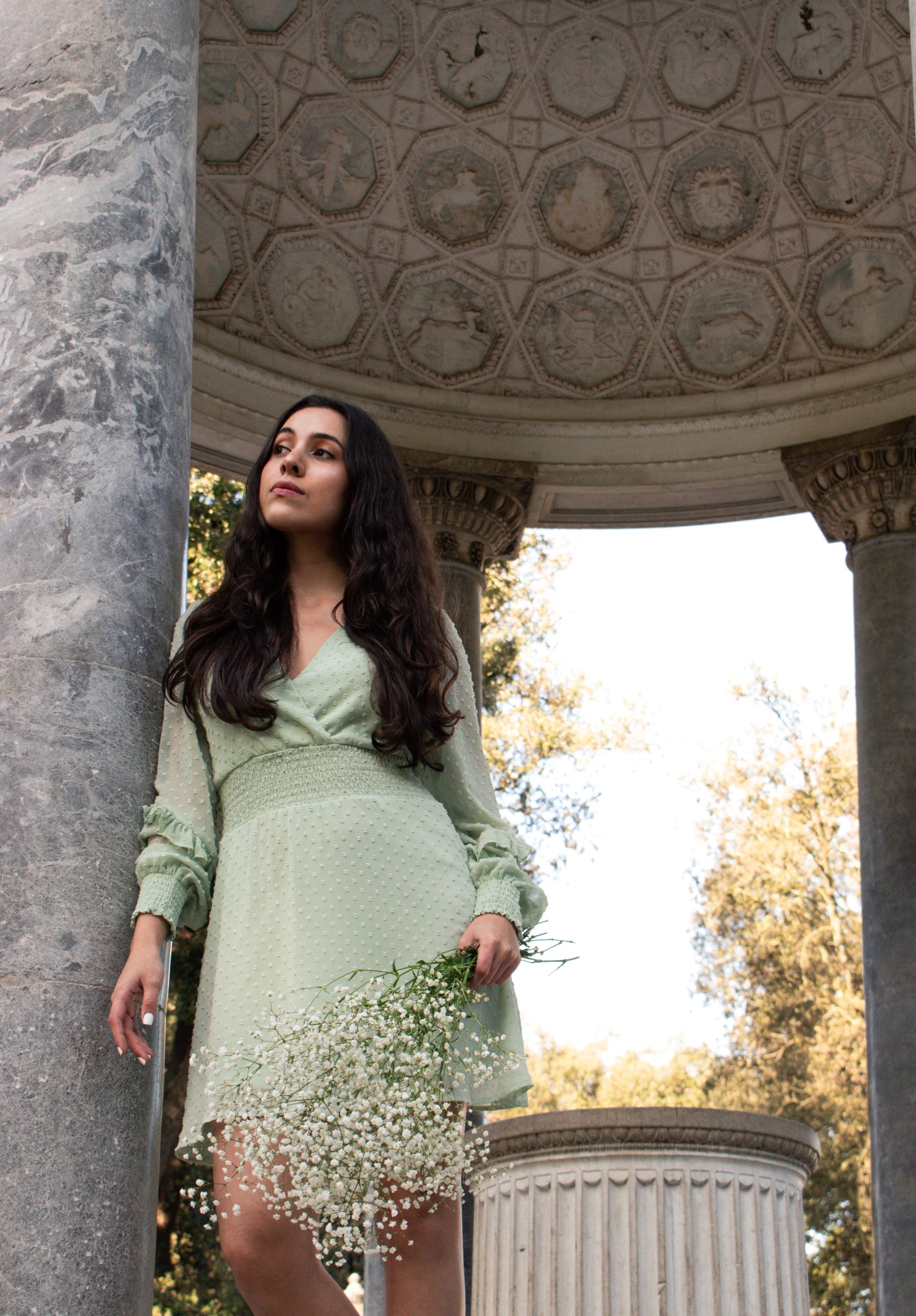 The natural morning light was perfect for capturing the warmth of the scene. Even without the statue, the temple remains charming in its details. With its reduced scale, this monument dedicated to the “goddess of the night light and lady of the woods” makes me feel as if I were the Roman goddess while walking between its columns. It was such a feeling that I wanted to express, and with the help of a bouquet, a pistachio green dress, and Karen as our model, we transformed it into a photo series. Different animals carved inside its dome form a beautiful monochromatic pattern. On the outside, the dome is cerulean green with a pinecone on the top, which confirms that I am certainly not the only one who dreams of and finds inspiration in Roman pines.